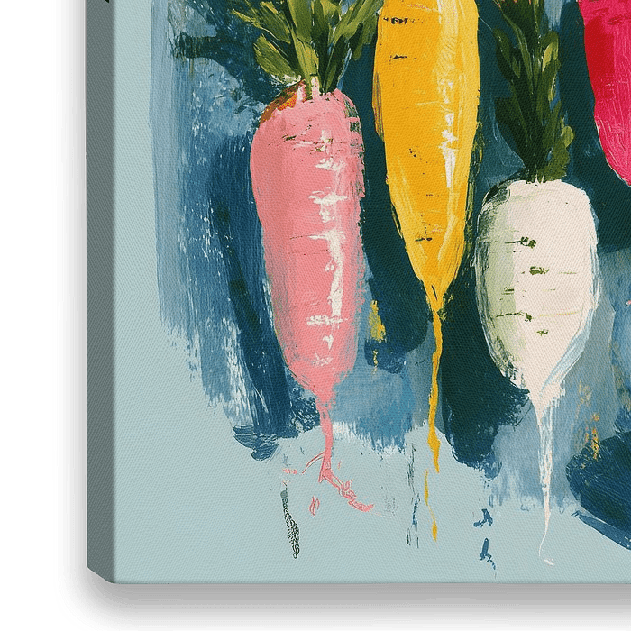 Een schilderachtig stilleven van wortelgroenten en bladgroen. De frisse blauwtint op de achtergrond zorgt voor rust, terwijl de kleuren van de groenten het werk levendig houden. Mooi in een keuken of eethoek.
