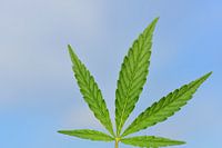 Een vers blad canabis voor een blauwe lucht met delicate wolken