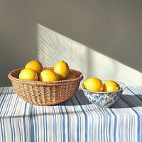 Een harmonieus spel van licht en schaduw omarmt de heldere, gele citroenen die rusten in een gevlochten mand en een fijne schaal. De zachte strepen van de tafel benadrukken de versheid van het fruit en nodigen uit om te genieten, terwijl de natuurlijke textuur van de manden het contrast met het gladde oppervlak van het servies versterkt.