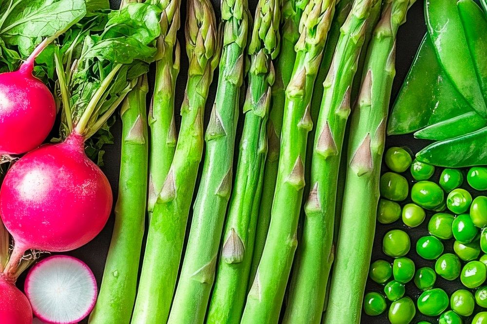 Frisse kleuren en knapperige texturen komen samen op deze stijlvolle schotel. De felrode radijsjes, malse asperges en sappige erwtjes nodigen uit om van te smullen. Dit arrangement is ideaal voor in de keuken en brengt leven en inspiratie in de keuken, perfect voor een gezond recept of als decoratieve blikvanger.