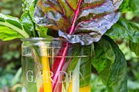 Een bos verse kleurrijke rabarber bladen in een vaas met daarop de tekst GARDEN