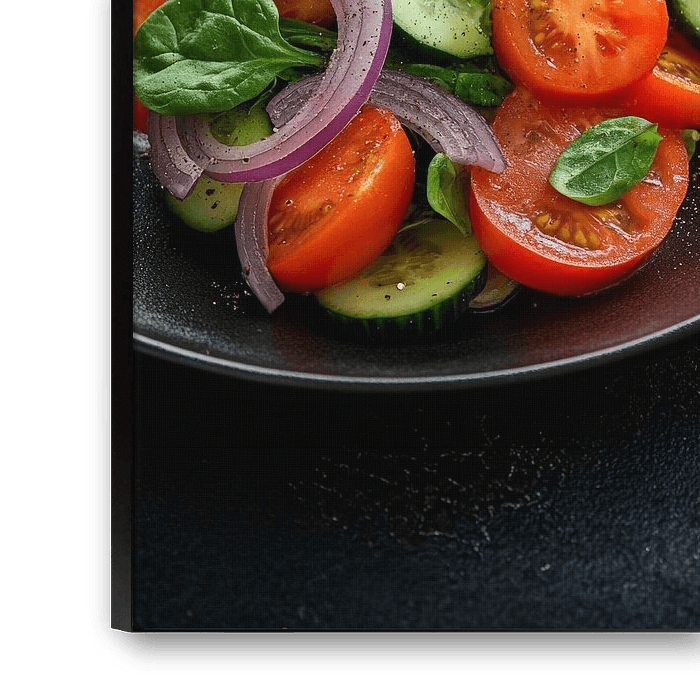 Frisse kleuren en knapperige texturen die smaak en vitaliteit uitstralen - deze salade is een feest voor de zintuigen. Tomaten, komkommers en uien harmoniëren perfect en nodigen uit om ervan te genieten. Ideaal voor in de keuken, het geeft elke ruimte een gezonde en uitnodigende sfeer die mensen aanmoedigt om samen te koken.