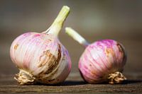 De geur van de verse knoflook walmt door de lucht en vult deze met zijn scherpe en hartige aroma. De foto vangt de schoonheid van verse knoflook, nog in zijn natuurlijke staat en onaangetast door enige bewerking of voorbereiding. Het contrast tussen het knapperige wit van de knoflookbollen en het rijke bruin van de grond waarin ze zijn geteeld, is bijzonder treffend en benadrukt het verband tussen de aarde en de ingrediënten die we gebruiken om ons te voeden. Voor wie van koken houdt, is verse knoflook een onmisbaar ingrediënt in zijn voorraadkast.