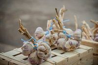 Foto van superverse knoflookbollen bijeengehouden door touwtjes op een typisch Frase markt in de Ardeche. De geur van deze verse knoflook komt je bijna tegemoet.