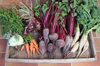 Vers geoogst uit het verhoogde bed. Op de houten schaal liggen koolrabi, rode uien, rode biet, witte radijs en wortelen.