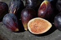 Close-up van verse rijpe vijgen op een metalen plaat. Eén vijg is opengesneden. Je kunt de pitjes zien.