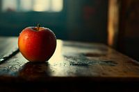 Een helderrode appel, fris en uitnodigend, rust in een zacht licht op een rustiek houten oppervlak. De fijne glans van het water geeft het een verleidelijke frisheid. Dit eiwit is perfect voor in de keuken, waar het herinneringen oproept aan verwennerij en gezond eten. Een echte blikvanger die aanzet tot snacken!