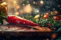 Felrode Spaanse peper omringd door fris groen viert de smaken van de keuken. Druppels Spaanse peper glinsteren in het licht en geven het houten bord een levendig karakter. Deze compositie brengt pit en levendigheid in elke keuken en inspireert tot creatieve culinaire avonturen. Een absolute must voor culinaire hoogstandjes!
