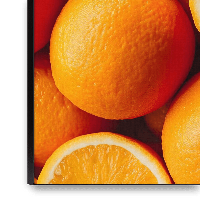 Dit levendige food art-motief toont een overvloed aan feloranje sinaasappels, waaronder verschillende gesneden vruchten, waarvan de sappige structuur en fijne vezels prachtig worden geaccentueerd. De levendige kleuren, gedetailleerde textuur en het natuurlijke licht stralen energie, frisheid en pure levensvreugde uit.