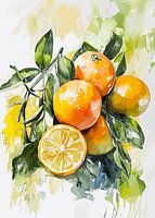 De foto toont een groep heldere sinaasappels met groene bladeren die er levendig en fris uitzien. Op de voorgrond ligt een gehalveerde citroen, waarvan de sappige binnenkant de kijker letterlijk aanspreekt. Het kleurenschema in warme gele en oranje tinten wordt aangevuld door het weelderige groen van de bladeren en geeft de foto een zomerse, verfrissende sfeer. De losse achtergrond in zachte groene tinten versterkt de natuurlijke indruk en benadrukt het fruit bijzonder goed.