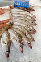 Verse vis op een dikke laag ijs wordt verkocht op de vismarkt. Deze vismarkt is in de haven van Ouistreham, een havenstadje in Normandië (Frankrijk).