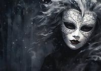 Versierd Geheim | Masker Portret Zwart-wit - Dit intrigerende canvas speelt met de diepe zwarttinten en zachte grijsnuances om een mysterieus gemaskerd figuur te onthullen, dat schuilgaat in een haast sluierachtige omgeving van abstracte vormen en lijnen. Het masker, rijkelijk versierd met ornamenten, voegt een tastbaar niveau van verfijning toe. De bekoring van het masker roept vragen op over wat er achter deze zorgvuldig samengestelde façade kan zitten, en versterkt het gevoel van geheimzinnigheid en ongrijpbare emoties.