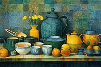 Koop dit stilleven Versierde Potjes en Kannen | Gedetailleerd Stilleven in Rust van Blikvanger Schilderijen op canvas, aluminium dibond, (ingelijste) fotoprint, behang en ArtFrame, op maat geprint in Fine-Art kwaliteit.