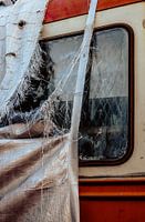 Over ‘Versleten Zeil & Raam – Retro Voertuigdetail in Rood-Oranje’ van Broodrooster Studio – Creatieve Fotografie