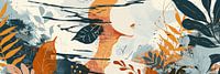 Versmelting | Modern Portret - Dit schilderij vangt de kijker met een gelaagde compositie waarin een vrouwelijk silhouet versmelt met abstracte, natuurlijke elementen. Het kleurenpalet is warm en aards, overheersend in tinten oranje en blauw met vegen en spatten die de dynamiek van de natuur suggereren.