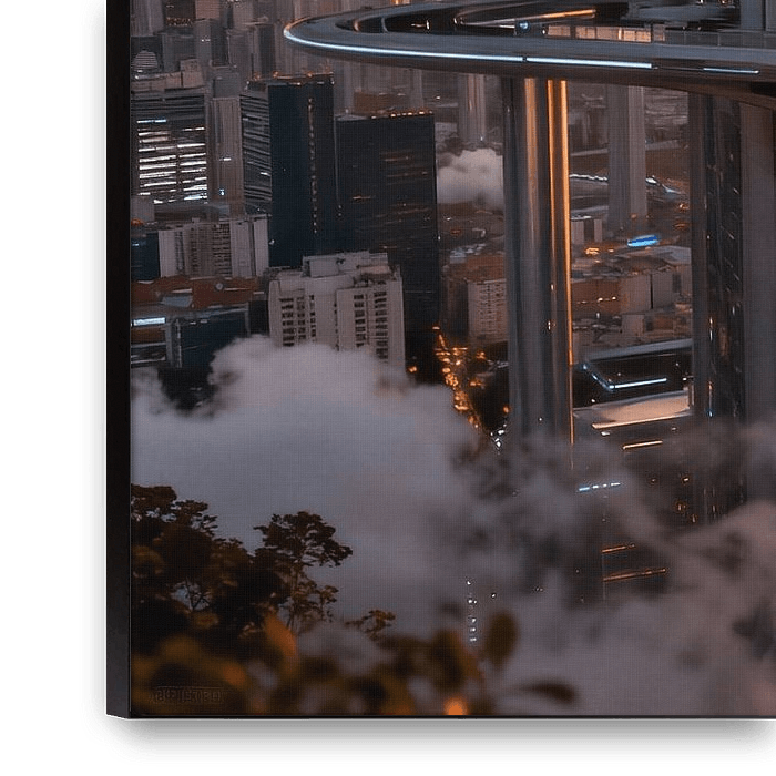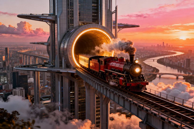 Dit werk zet tijd op scherp. Een stoomlocomotief, symbool van industriële oorsprong en mechanische kracht, dendert uit een futuristische tunnel hoog boven de stad. Onder haar ontvouwt zich een moderne metropool in avondlicht, strak, efficiënt en glanzend. De trein hoort hier niet te zijn — en toch past hij perfect. Dat spanningsveld is…