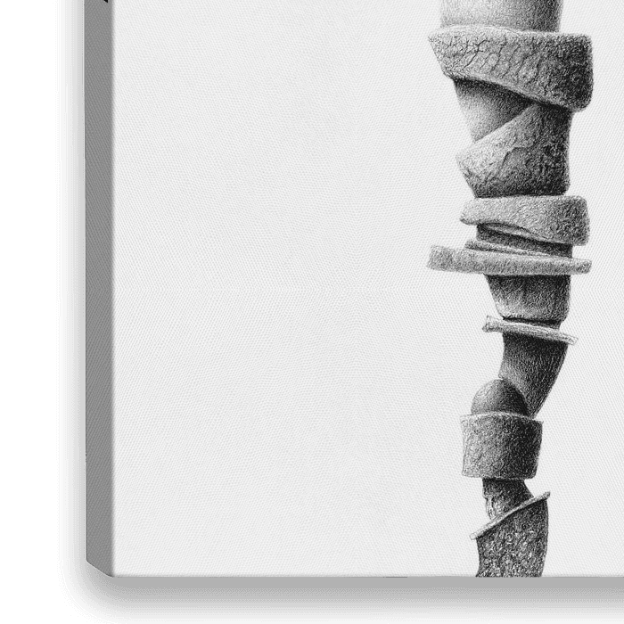 Versteend evenwicht is een potloodtekening van een mensfiguur die in stilte balans vindt te midden van een spiraal van stenen ringen. Het zachte, levendige bovenlichaam contrasteert met de ruwe, gebarsten texturen: huid tegenover steen, kwetsbaarheid tegenover kracht. De armen reiken horizontaal als een koorddanser; niet om te wankelen,…