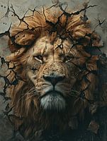 Dit artistieke portret vangt een leeuw in een moment van stille kracht, waarbij de contouren van zijn gezicht naadloos overgaan in een patroon van barsten en scheuren. De diepe bruintinten van zijn manen en het subtiele grijs van de verweerde achtergrond geven het beeld een stoere en robuuste uitstraling. Accenten van zwart en een subtiel palet van aardse kleuren zorgen voor een dramatische, bijna driedimensionale diepte. Deze krachtige afbeelding zou uitstekend passen in een modern of industrieel interieur, waar de ruwe texturen en aardse kleuren een natuurlijke verbinding vormen met elementen als metaal, hout, en beton.