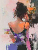 Een vrouw, afgebeeld van achteren, staat centraal in dit krachtige schilderij. Haar zwarte haar is elegant opgestoken, een gebaar van ingetogen schoonheid. Ze draagt een eenvoudig zwart hemdje, wat een scherp contrast vormt met de levendige kleurvlakken die haar omringen. De achtergrond is opgebouwd uit expressieve stroken groen, oranje, roze, wit en zwart – aangebracht met een paletmes, waardoor het werk een tastbare textuur krijgt.