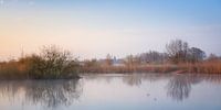 Verstild landschap met vliegende eenden. Een oude zijtak van de rivier de IJssel, 's morgens vroeg in het eerste licht vliegen een paar eenden voorbij.