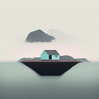Verstild landschap #09 - Een print van een klein eiland omgeven door deels kale bergen in de zeemist in de verte. Midden op het eiland staat een blauw huis. Deze verlaten plek op de wereld ademt rust en eenvoud. Een perfecte locatie om je terug te trekken uit de hectiek van alledag.