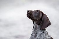 "Verstilde Aandacht" is een ontroerend portret van een Kortharige Duitse Staande hond, vastgelegd in een moment van pure focus. De fijne details van de vachttextuur en de zachte overgang van zijn kenmerkende gevlekte grijs naar de diepe chocoladebruine kleur van zijn oren en ogen worden benadrukt tegen de neutrale achtergrond. Zijn opwaartse blik weerspiegelt een wereld van trouw en intelligentie, typisch voor dit ras. Deze foto zou een prachtige aanvulling zijn voor elke hondenliefhebber of een stijlvol accent in een rustiek of landelijk interieurontwerp.