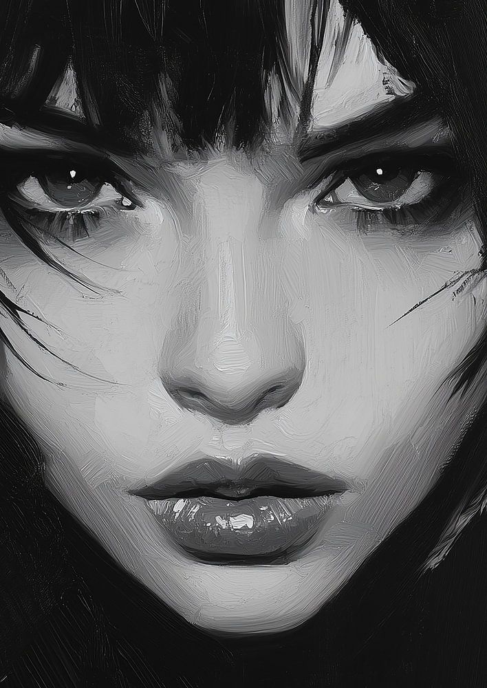 Een sfeervol olieportret van een meisje, uitgevoerd in zwart-wit, waarbij gedurfde, expressieve penseelstreken de compositie domineren. Het meisje heeft donker haar en diepe, donkere ogen die een kille, afstandelijke uitdrukking uitstralen. Ze is frontaal afgebeeld, waarbij haar gelaatstrekken gedeeltelijk vervaagd zijn, wat bijdraagt aan de mysterieuze en dromerige sfeer van het werk. De achtergrond bestaat uit een grove, grijze textuur met ruwe randen, waardoor het contrast met het zachte gezicht subtiel is. Ondanks de lage contrasten en de zachte belichting, bevat het schilderij rijk gedetailleerde elementen die de aandacht trekken. Het samenspel van de minimalistische kleuren en de ruwe techniek geeft het geheel een melancholische, maar ook intrigerende uitstraling.