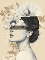 "Verstilde Bloei" is een visuele poëzie in lijn, bloem en stilte. Het kunstwerk toont een vrouwelijk profiel, uitgevoerd in een gedetailleerde lijntekening, dat wordt onderbroken en verrijkt met fragmenten van bloemen. Deze bloemen – elegant, sereen en groot in verhouding tot het gezicht – groeien als het ware uit haar hoofd en ogen. Ze bedekken het zicht, maar openen tegelijkertijd een innerlijke wereld vol zachtheid en kracht.