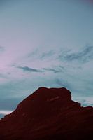 Een krachtig silhouet dat rust tegen een hemel van pastel en nevel. Deze foto vangt het moment waarop de dag overgaat in de nacht en de aarde een scherp contrast vormt met de ijle lucht. Een sereen en mystiek beeld dat diepte geeft aan elke muur.