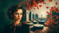 Ik omhul een perfect gestileerde vrouw in filmisch licht: haar porseleinen huid, retro-kapsel en dieprode lippen wekken glamour op, maar in haar blik sluimert onverwoord verdriet. Dat onderhuidse gevoel—mijn ode aan Erwin Olaf—contrasteer ik met een oneindig decor van cilindrische plateaus dat rechtstreeks knipoogt naar Eschers rationele ruimtestudies. De vurige herfstbladeren vormen de visuele brug: schoonheid in verval die jouw oog van het intieme portret naar de verre horizon leidt.
