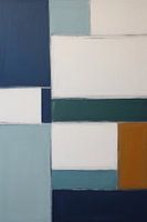 "Verstilde Kleurblokken" is een abstract schilderij dat kenmerkend is voor minimalisme in moderne kunst. Het werk bestaat uit zorgvuldig geplaatste blokken in pastelkleuren, afgewisseld met diepe marineblauwe tonen, wat zorgt voor een rustgevend geheel. De compositie getuigt van een doordachte vlakverdeling, waarbij elke kleur zowel op…