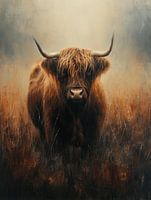 "Verstilde Pracht van de Hooglanden" is een meeslepend portret dat de serene en ongetemde schoonheid van een Schotse Hooglander belichaamt. De stier staat centraal tegen een nevelige, atmosferische achtergrond, die de mystiek van de Hooglanden oproept. De warme gloed van de ondergaande zon reflecteert op zijn vacht, waardoor er een subtiele schittering ontstaat die het tafereel een zachte, bijna etherische kwaliteit geeft. Dit kunstwerk zou niet misstaan in een omgeving die zowel de rust van de natuur als de nobele uitstraling van dit majestueuze dier waardeert.