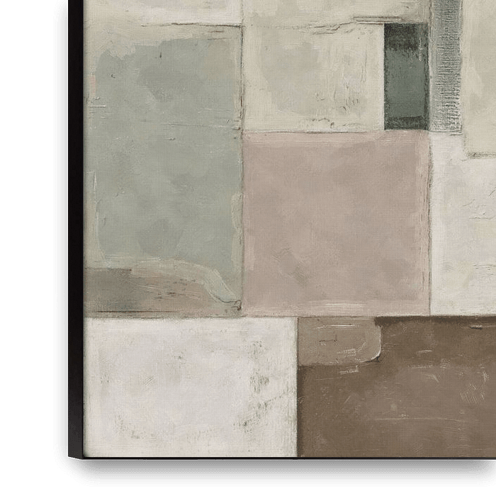 Dit werk is opgebouwd uit een mozaïek van zachte geometrie. De rechthoeken en vierkanten zijn geschilderd in neutrale tinten: zandwit, grijsblauw, krijtgroen, oker en bruin. De verf is mat, licht textuur blijft zichtbaar – genoeg om de diepte te voelen zonder visueel te overheersen.