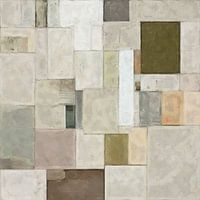 Dit werk is opgebouwd uit een mozaïek van zachte geometrie. De rechthoeken en vierkanten zijn geschilderd in neutrale tinten: zandwit, grijsblauw, krijtgroen, oker en bruin. De verf is mat, licht textuur blijft zichtbaar – genoeg om de diepte te voelen zonder visueel te overheersen.
