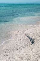 De kustlijn in deze foto heeft een mooie golfbeweging. De diagonale lijn door deze afbeelding deelt de foto op in een aquakleurig en kiezelkleurig deel. Het is een dromerig sfeerbeeld dat in veel interieurs een mooie toevoeging van kleur geeft.