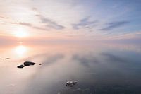 Zachte pasteltinten tijdens de rustige zonsondergang aan de Friese Waddenkust. Windstil waardoor het wateroppervlak van de Waddenzee een spiegel is.