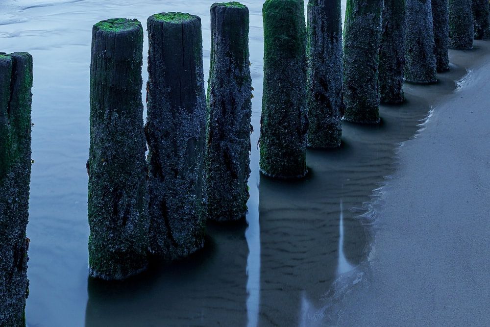 verstilling aan zee als de straffe wind is gaan liggen........palen van een golfbreker gaan op het verdwijnpunt kopje onder in de kalme zee....