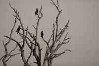 Dit beeld ontstond in een moment waarop niets hoefde te gebeuren. In kale takken zitten Aalscholvers, ieder op zijn eigen plek. Geen beweging, geen richting, alleen aanwezigheid. Wie langer kijkt, ziet het ritme in de lijnen en de kleine verschillen in houding. Geen enkele vorm is hetzelfde, en toch klopt het geheel.