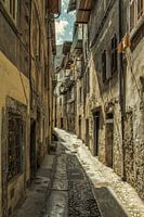 Een smal straatje in Tende, een Frans bergdorp in de Alpen met verschillende middeleeuwse huizen uit de 15e eeuw. Tende ligt in het achterland van de mondaine Cote d' Azur. Het werk toont het opdrogende straatje na een regenbui en speelt de zon met de schaduwen op de muren. Een heerlijk rustgevend beeld. De tijd heeft hier stilgestaan!