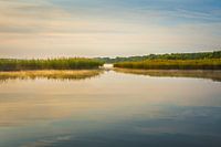 In de vroege ochtend aan de Grabendorfersee. Een eenzame eend zwemt als een koning te rijk in het vlakke water