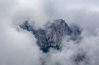 Een imposante rotspunt doemt op tussen de laaghangende wolken in de Franse bergen. Het beeld ademt stilte, mysterie en pure natuurkracht.