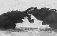In een meertje in het Pilanesbergpark in Afrika kwam ik dit verliefde olifantenpaar tegen. De dieren hielden een paringsritueel waarbij ze ook hun slurven in elkaar draaiden. Vanwege het harde licht heb ik de foto's omgezet in zwartwit. Voor meer olifanten zie: http://naturebylennart.com/mammals-blog/elephants/
