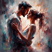 Een man en een vrouw zijn afgebeeld in een innige omhelzing, hun voorhoofden raken elkaar teder aan tijdens een moment van intimiteit. De afbeelding is weergegeven met een dynamische mix van penseelstreken die een gevoel van beweging en emotie geven, met een warm kleurenpalet dat bijdraagt aan de romantische sfeer.