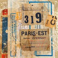 Collage van franse oude postzegels, etiketten, stempels en verzendlabels voor de stad Parijs
