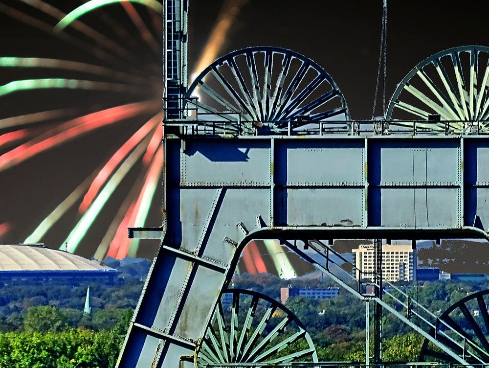 Fotocollage des Förderturmes der Zeche Ewald in Herten mit einem Feuerwerk und der Veltins Arena in Gelsenkirchen im Hintergrund