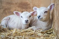 Koop de foto Vertederende foto van twee jonge lammetjes naast elkaar liggend in het stro van Birgitte Bergman op canvas, aluminium dibond, (ingelijste) fotoprint, behang en ArtFrame, op maat geprint in Fine-Art kwaliteit.