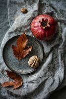 Verticaal stilleven van vers fruit (granaatappel en granaatappelblad en walnoten) op een gestructureerde achtergrond