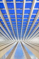 Prachtige abstracte opname van het moderne treinstation Luik-Guillemins (Liège-Guillemins) in Luik, Belgie, met een perspectief lijnen van stalen balken in het blauwe uur