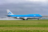 KLM Boeing 747-400 stijgt op van een natte Buitenveldertbaan van luchthaven Schiphol.