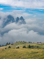 Sciliar in wolken op de Alpe di Siusi in de Dolomieten, Zuid-Tirol, Italië.